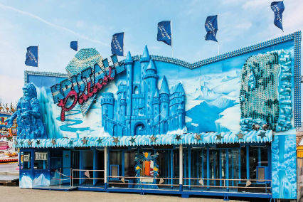Über dem Eingang des Palastes thront der große Eis-König, der sich über viele Besucher in seinem Irrgarten freut.